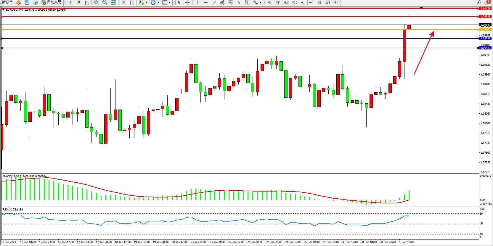 欧元美元EURUSD—4小时K线图显示: