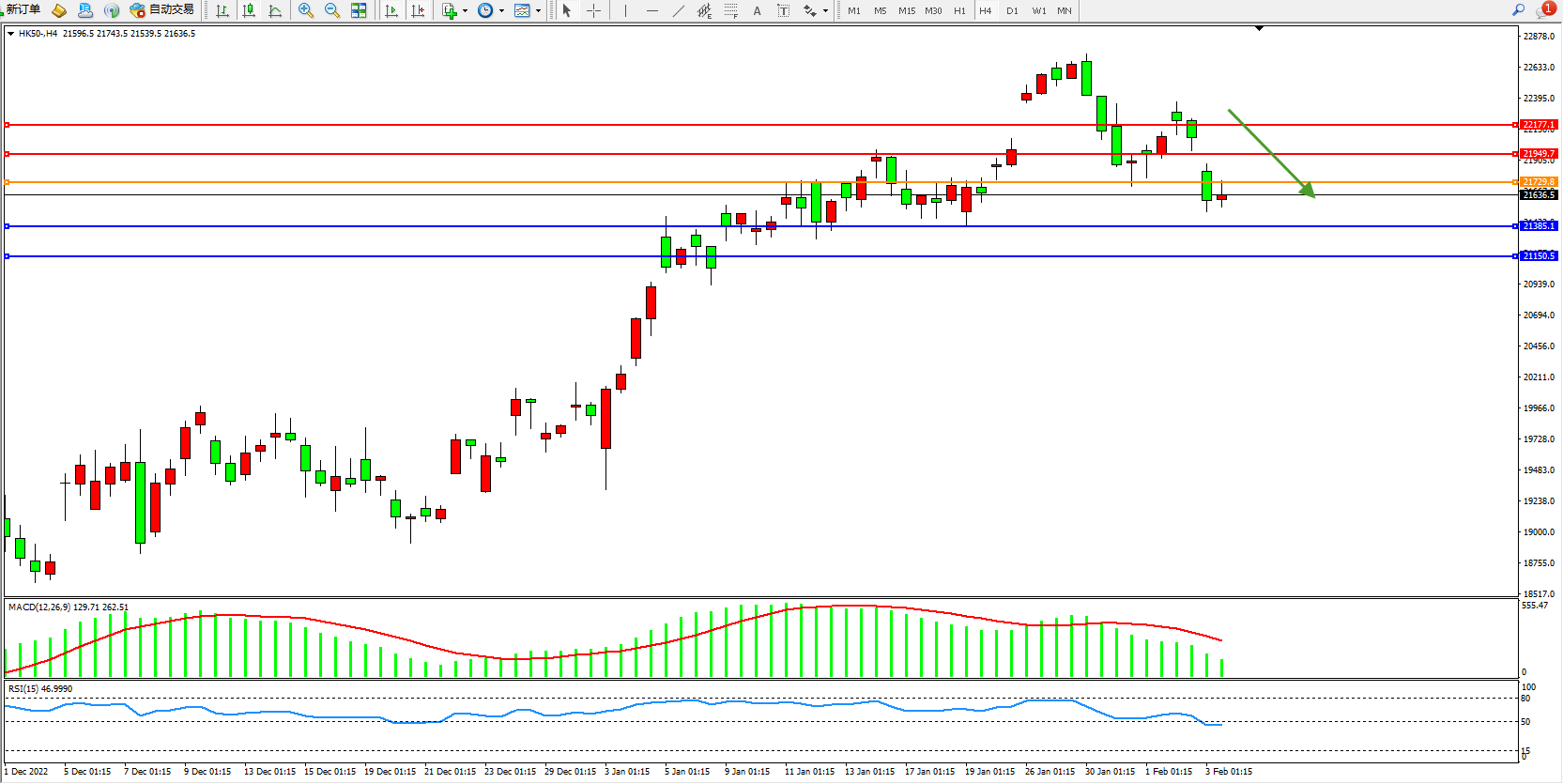 香港恒生指数2月3日(周五)收盘下跌297.89点,跌幅1.36%,报21660.47点;港股三大指数全天呈下跌行情,午后跌幅小幅收窄,恒指最终下跌1.36%,国指跌1.58%,恒生科技指数跌1.33%,本周三大指数全线回撤,恒指累跌4.5%。为市场风向标的科技股多数下跌,百度跌4.4%,阿里巴巴、快手、京东、美团均跌超2%,腾讯、网易小幅上涨;南下资金净流入15.24亿港元,大市成交额为1299亿港元。