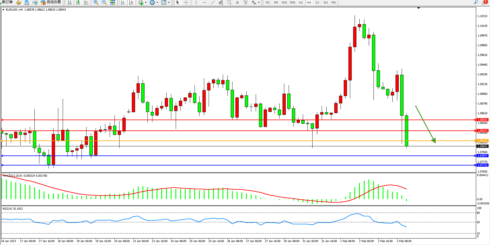 欧元美元EURUSD—4小时K线图显示: