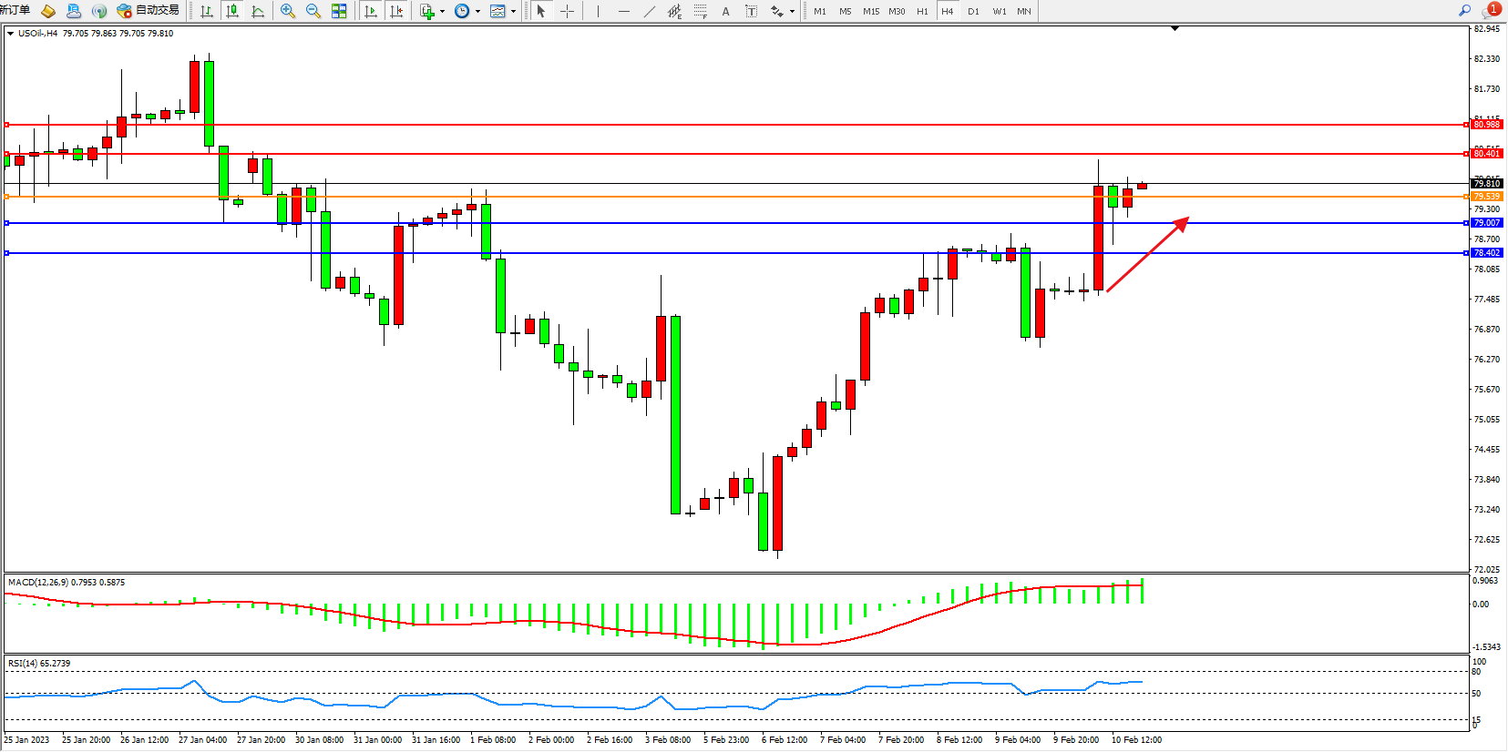 交易策略:75.539上方看涨,目标80.401、80.988