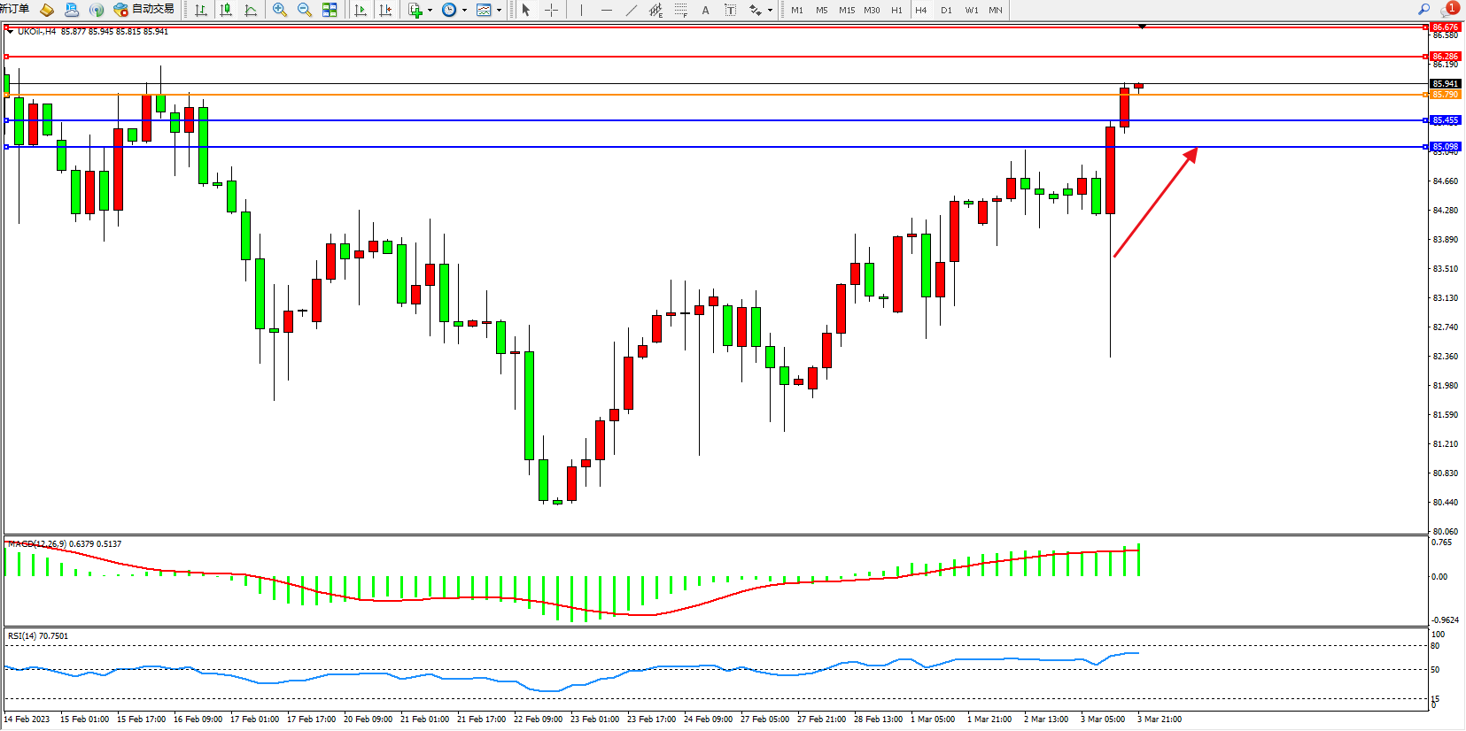 4小时图看:多头动力强势飙升,市场看涨情绪涌现,市场多头不断向上拉升,MACD指标处于多头区域持续上移,RSI指标处于多头区域缓慢上行;