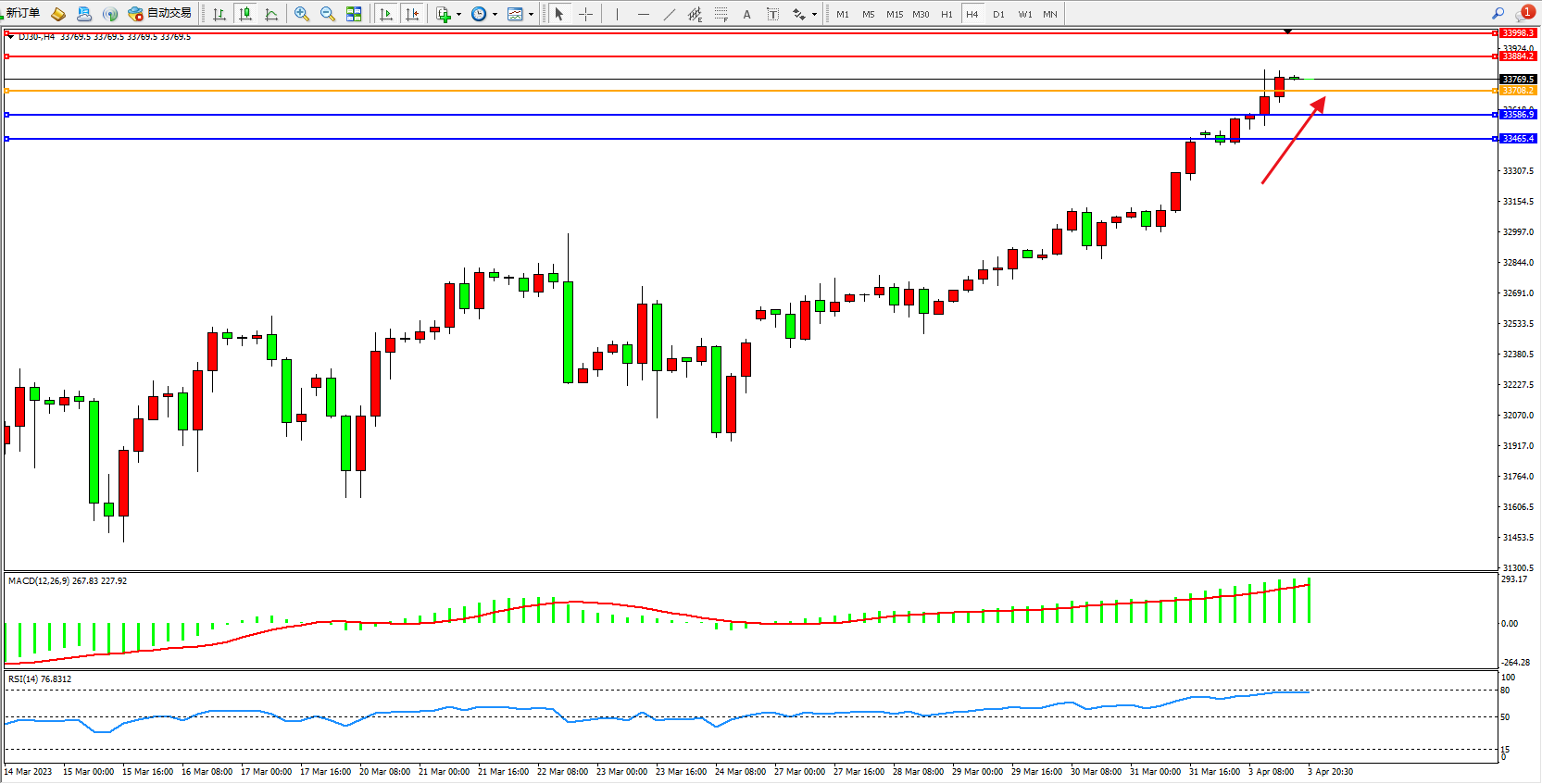 道琼斯指数4月3日(周一)收盘上涨326.77点,涨幅0.98%,报33600.92点;交易员押注美联储可能需要在5月份会议上再次加息。但市场并未排除美联储年内降息可能,美元看涨人气受到挑战,美指回落转跌。