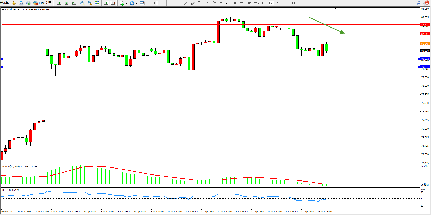 4小时图看:高位空头动力维持窄整理的下行,市场空头情绪逐渐涌现,MACD指标处于0轴线下侧弱势徘徊,RSI指标处于50均衡线下侧弱势整理;
