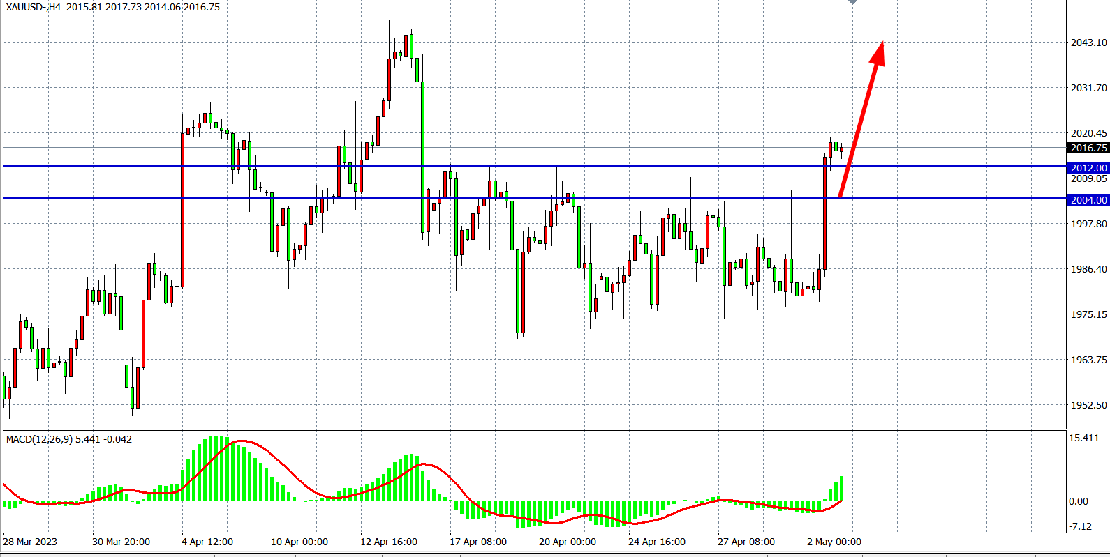 4小时图看,黄金强势上冲破2012,多日来的宽幅盘整区间打破,MACD量能在零轴之上大幅放量,行情回归多头,目前支撑上移至2004-2012区域,日内在2004之上继续看涨为主,上方目标2030-2045附近。