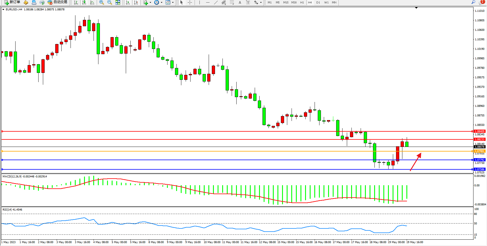 欧元美元EURUSD—4小时K线图显示: