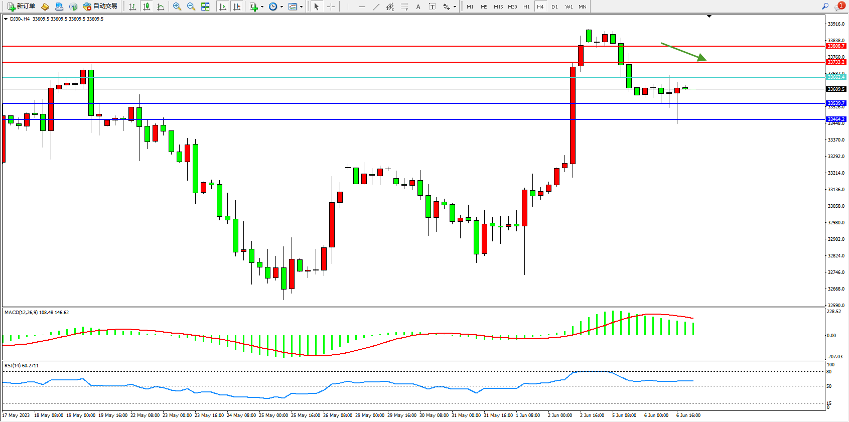 道琼斯指数6月6日(周二)收盘上涨10.42点,涨幅0.03%,报33573.28点;美国劳动力市场新增就业人数的稳定增长支持了进一步加息的必要性,而持续收缩的工厂活动和低于正常水平的服务活动表明,美联储应该暂时暂停政策紧缩,观察加息的影响。