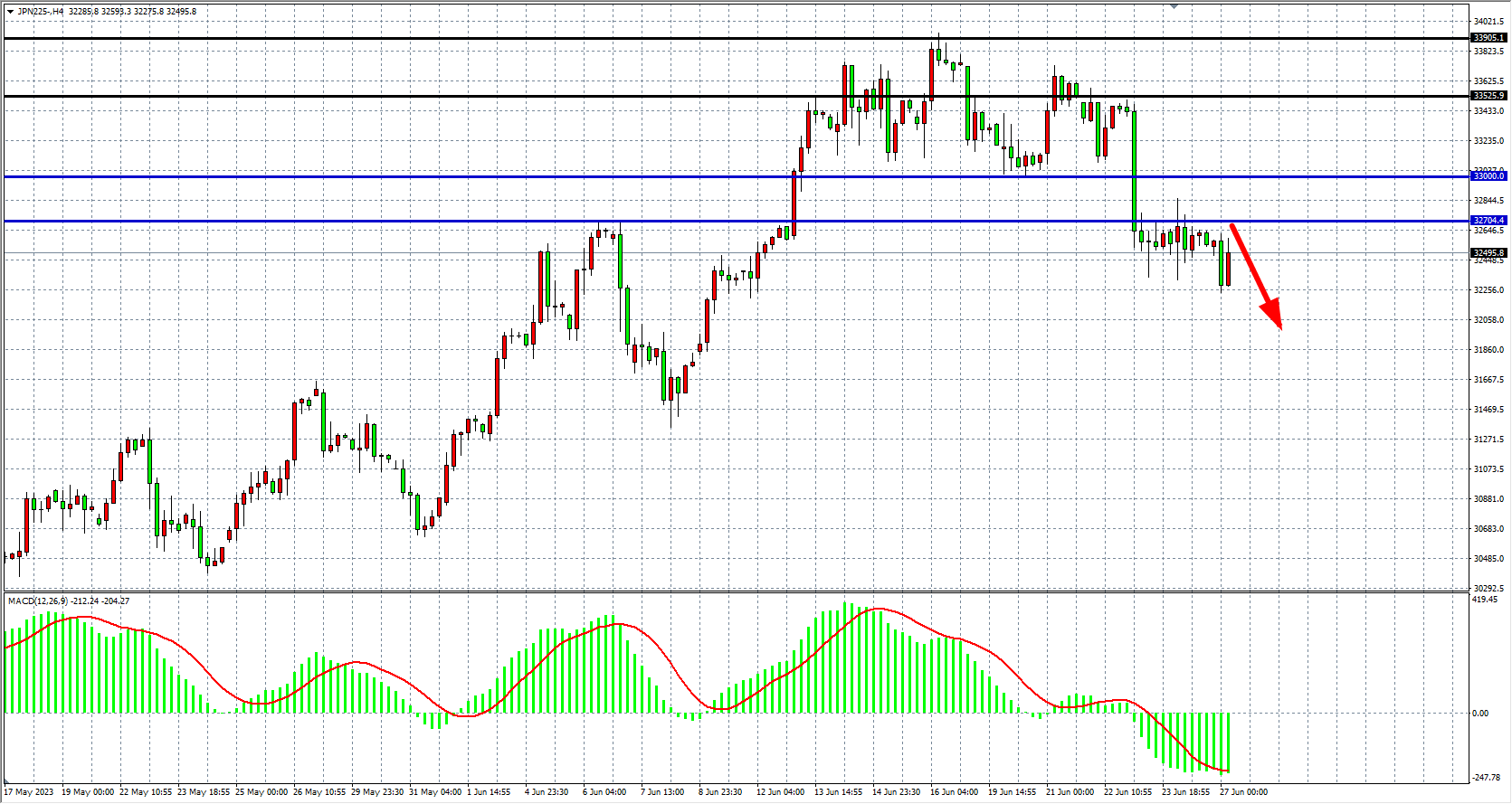 周二(6月27日)日经225指数收盘下跌148.31点,跌幅0.45%,报32550.50点。因美国和欧洲上周公布的疲弱的商业调查数据引发对全球经济放缓的担忧,日本股市下滑。