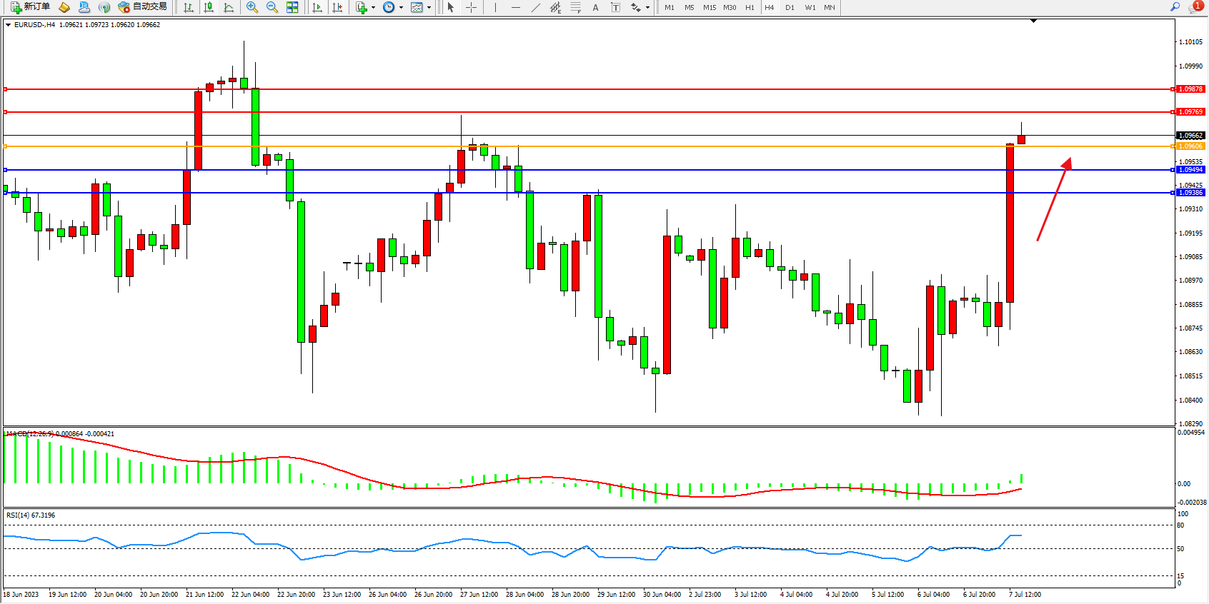 欧元兑美元维持1.09662附近震荡, 欧洲央行行长拉加德说,如果官员们看到企业利润率和薪资同时上升,央行将会毫不犹豫地采取行动。