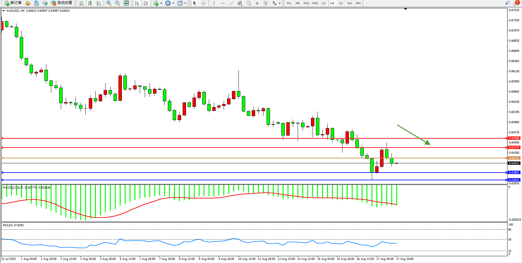 交易策略:0.64135下方看跌,目标0.63802  0.63632