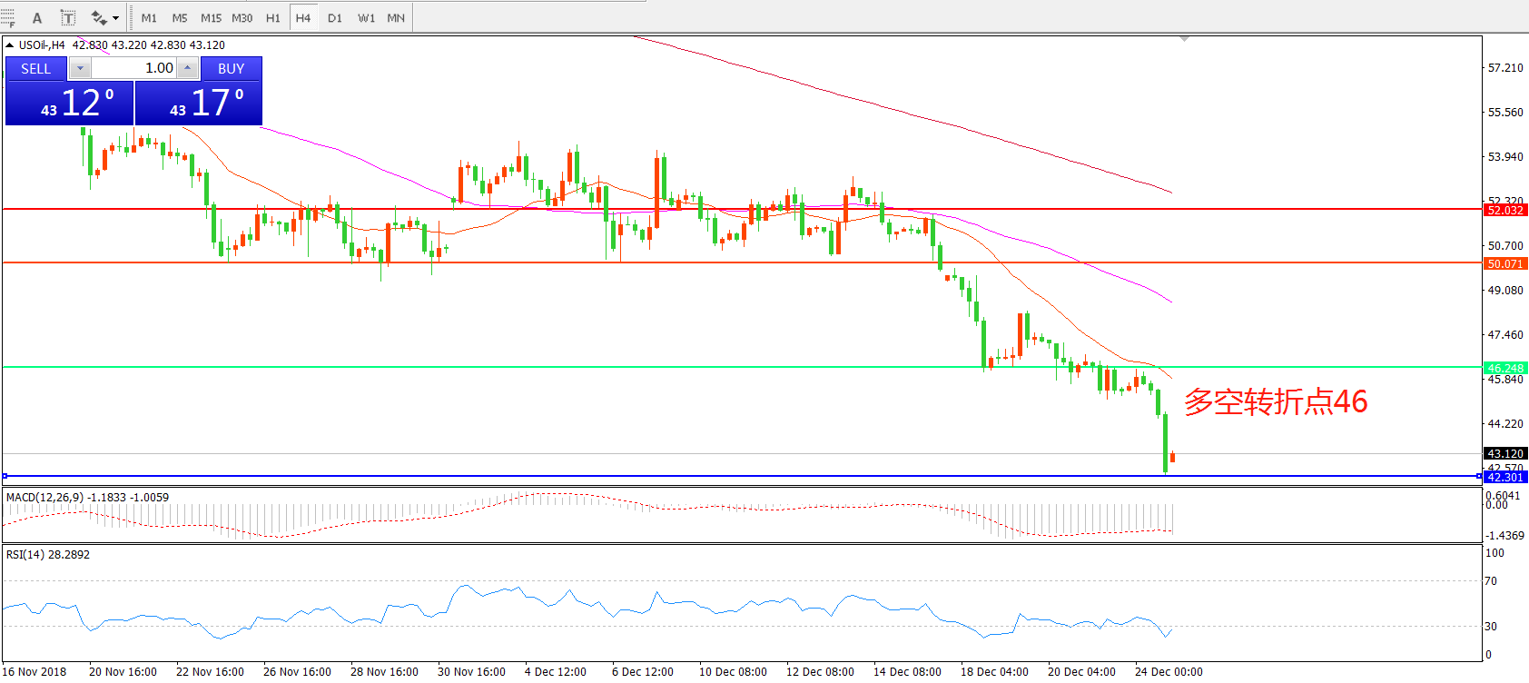 4小时图看,油价跌破前期低点破位下行,均线系统呈空头排列,MACD绿柱增加,后期预计仍是震荡偏空走势。