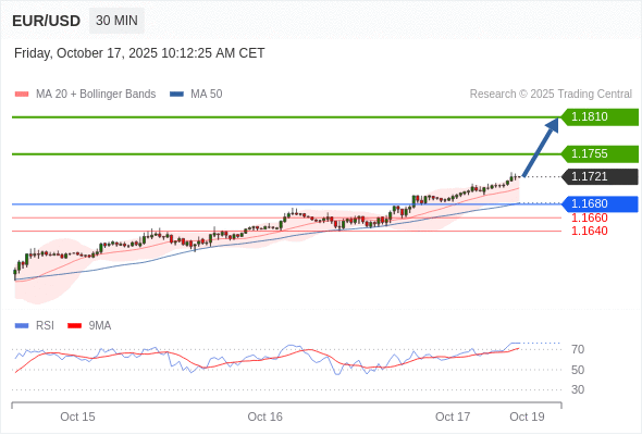 欧元/美元 当日内: 在1.1680之上,看涨。