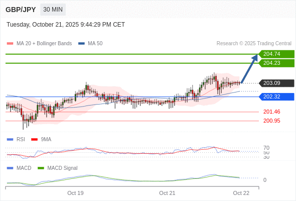 英镑/日元 当日内: 看涨,当 202.32 为支撑位,目标定在204.74。