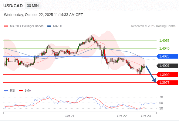 在 1.4025 之下,看跌,目标价位为 1.3990 ,然后为 1.3975 。