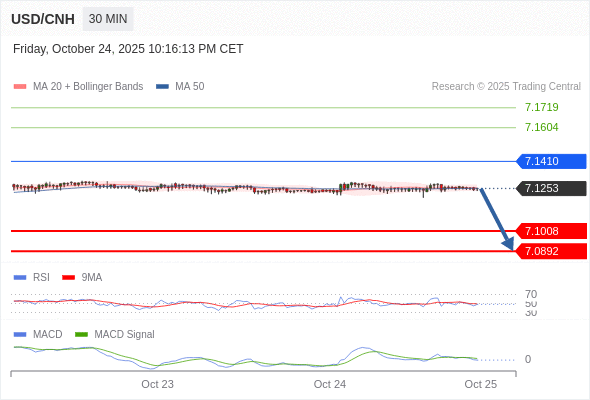 备选策略: 如突破 7.1410 ,USD/CNH 目标方向为 7.1604 和 7.1719 。