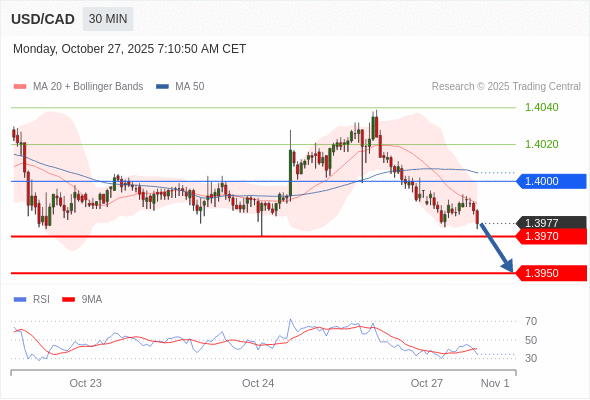 在 1.4000 之下,看跌,目标价位为 1.3970 ,然后为 1.3950 。