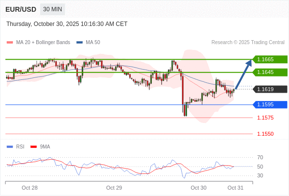 在 1.1595 之上,看涨,目标价位为 1.1645 ,然后为 1.1665 。
