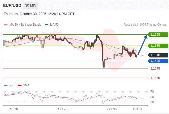 在 1.1595 之上,看涨,目标价位为 1.1635 ,然后为 1.1665 。