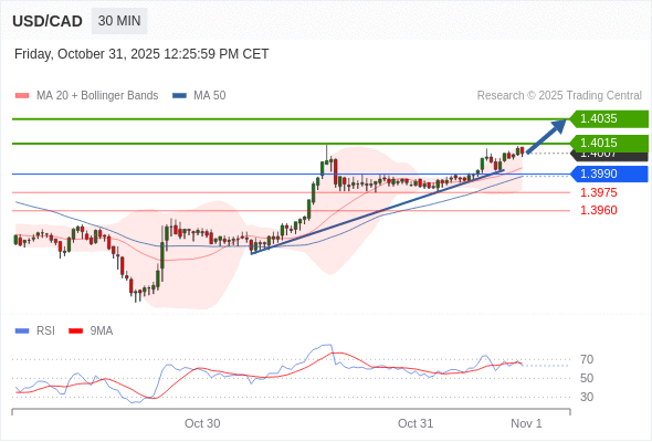 在 1.3990 之上,看涨,目标价位为 1.4015 ,然后为 1.4035 。