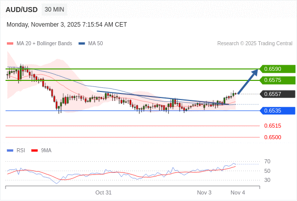 在 0.6535 之上,看涨,目标价位为 0.6575 ,然后为 0.6590 。
