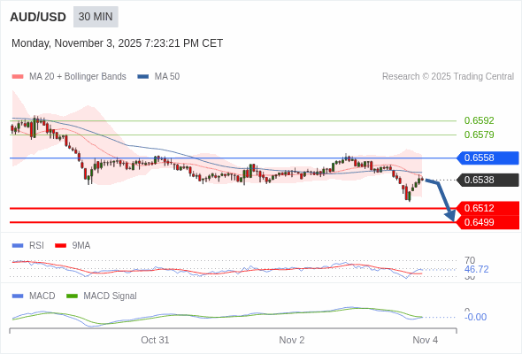 澳元/美元 当日内 : 看跌,在 0.6558 之下。