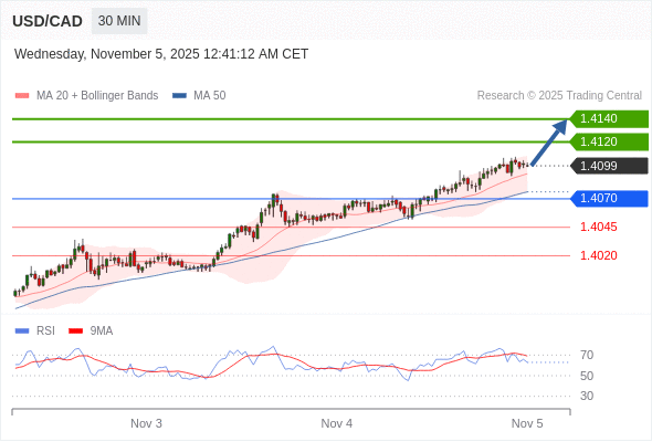 在 1.4070 之上,看涨,目标价位为 1.4120 ,然后为 1.4140 。