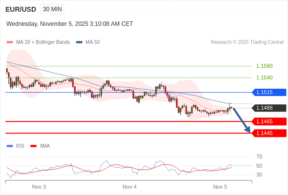 在 1.1515 之下,看跌,目标价位为 1.1465 ,然后为 1.1445 。