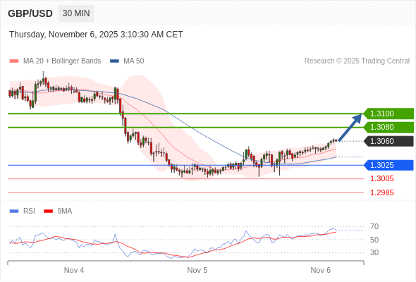 在 1.3025 之上,看涨,目标价位为 1.3080 ,然后为 1.3100 。