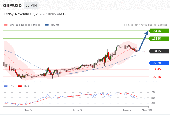 在 1.3070 之上,看涨,目标价位为 1.3165 ,然后为 1.3195 。