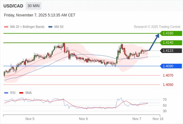 在 1.4090 之上,看涨,目标价位为 1.4140 ,然后为 1.4160 。