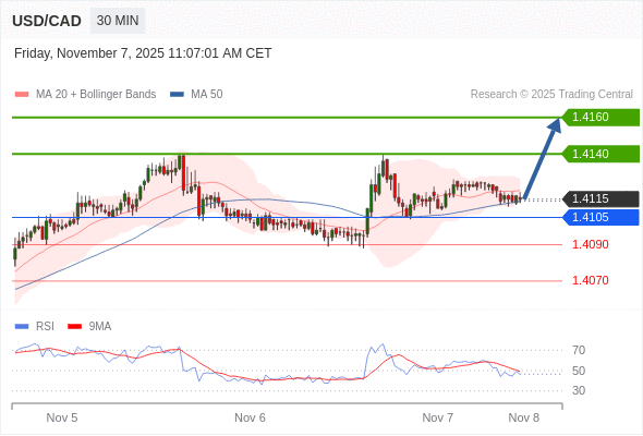 在 1.4105 之上,看涨,目标价位为 1.4140 ,然后为 1.4160 。