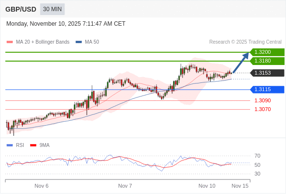 在 1.3115 之上,看涨,目标价位为 1.3180 ,然后为 1.3200 。