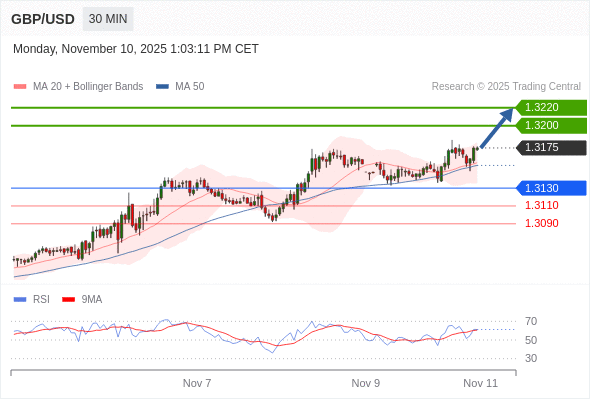 在 1.3115 之上,看涨,目标价位为 1.3200 ,然后为 1.3220 。