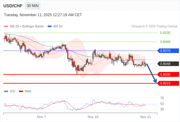 在 0.8070 之下,看跌,目标价位为 0.8030 ,然后为 0.8015 。
