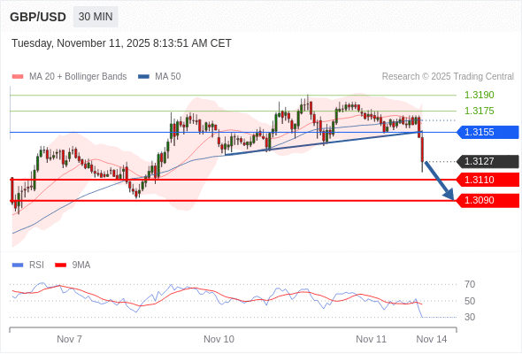 在 1.3155 之下,看跌,目标价位为 1.3110 ,然后为 1.3090 。