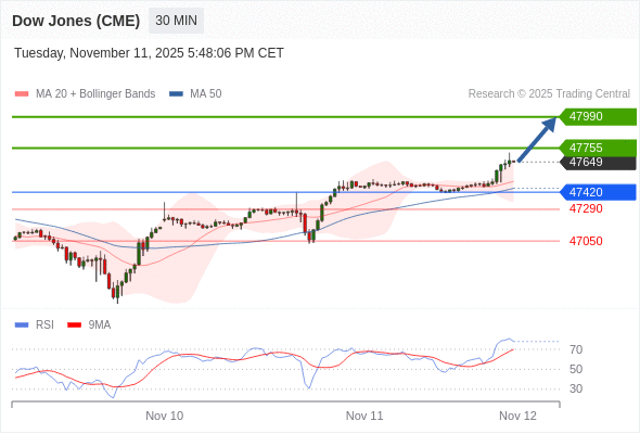 在 47420 之上,看涨,目标价位为 47755 ,然后为 47990 。