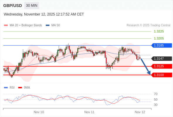 在 1.3185 之下,看跌,目标价位为 1.3125 ,然后为 1.3100 。