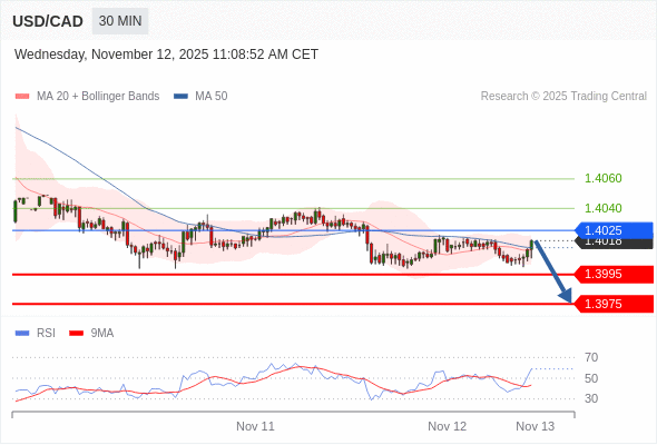 在 1.4025 之下,看跌,目标价位为 1.3995 ,然后为 1.3975 。