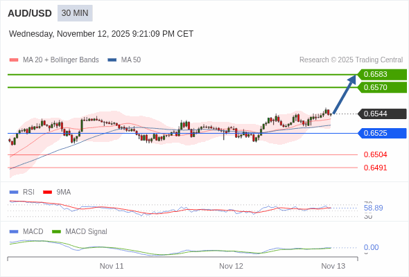 澳元/美元 当日内 : 看涨,当 0.6525 为支撑位。