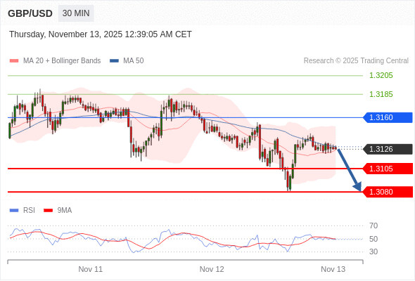 在 1.3160 之下,看跌,目标价位为 1.3105 ,然后为 1.3080 。