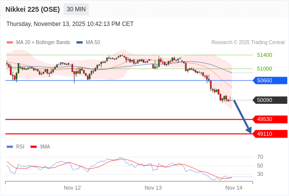 在 50660 之下,看跌,目标价位为 49530 ,然后为 49110 。