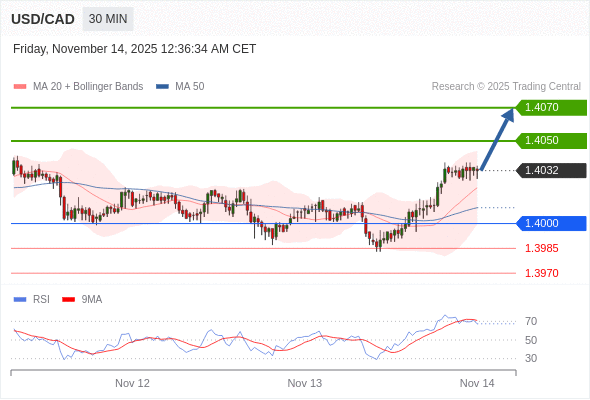 在 1.4000 之上,看涨,目标价位为 1.4050 ,然后为 1.4070 。