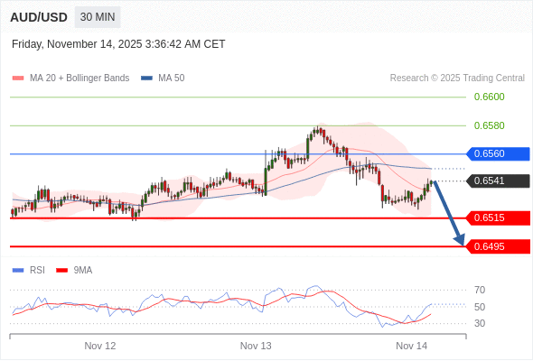 在 0.6560 之下,看跌,目标价位为 0.6515 ,然后为 0.6495 。