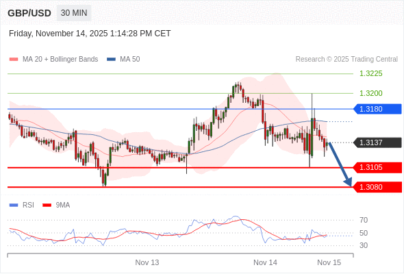 在 1.3180 之下,看跌,目标价位为 1.3105 ,然后为 1.3080 。
