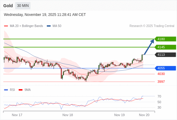 在 4055 之上,看涨,目标价位为 4145 ,然后为 4180 。