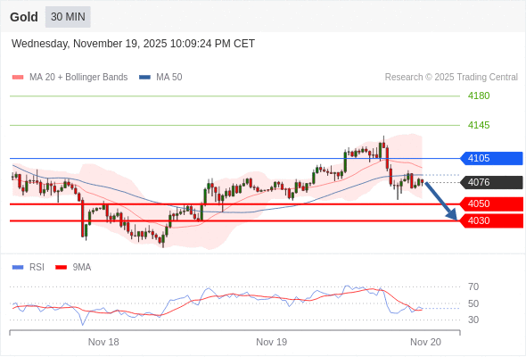 在 4105 之下,看跌,目标价位为 4050 ,然后为 4030 。