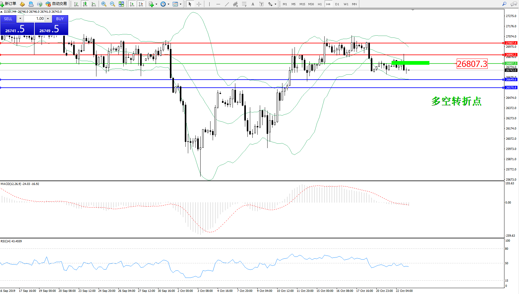 技术点评:多头动力高位遇阻回撤,跌破布林带中轨后维持在中下轨区间震荡,空头下行动力有持续弱势迹象,MACD指标跌破轴线后弱势窄幅整理中,RSI指标处于50均衡线下方持续徘徊;