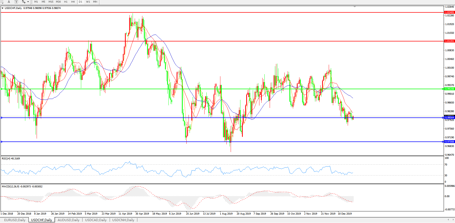 技术面简析:日线图均线呈有序空头排列,汇价弱势整理于0.98关口附近,MACD运行于0轴下方且量能0轴下有放量迹象,RSI小幅震荡走高,预计汇价在反弹整理后将进一步下行。