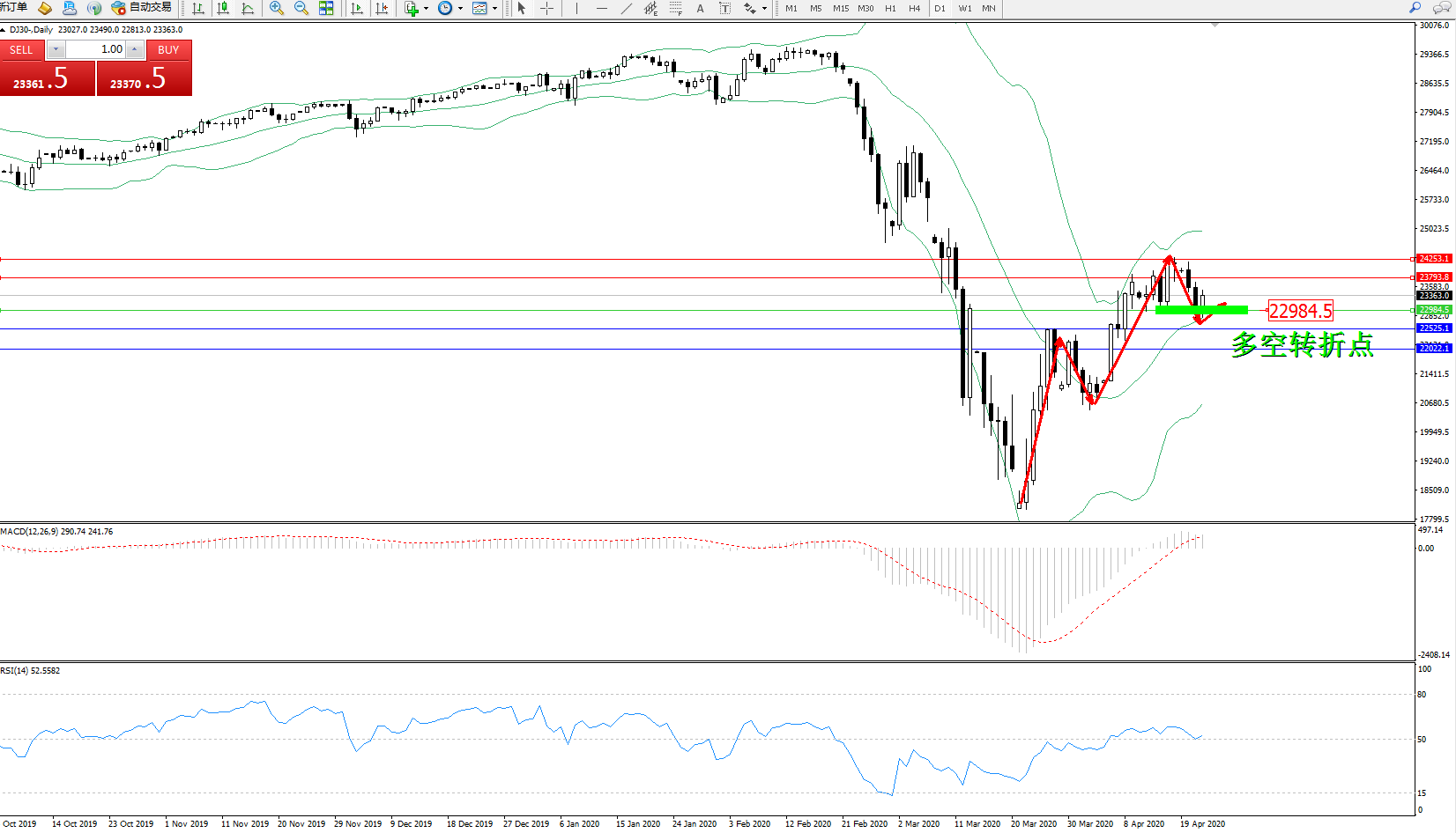 道琼斯指数4月22日(周三)收盘上涨456.90点,涨幅1.99%,报23475.82点。美国股市止步两连跌,投资者消化了最新一轮公司季报,并且对于最终解封防疫限制措施的乐观预期升温。一些公司季报点燃了复苏可能比预期来得更早的希望。信息技术板块领涨,其次是能源板块;日常消费品板块领跌,其次是金融板块。推动股市反弹的是隧道尽头的光明,重新开放经济活动的前景日趋明朗。