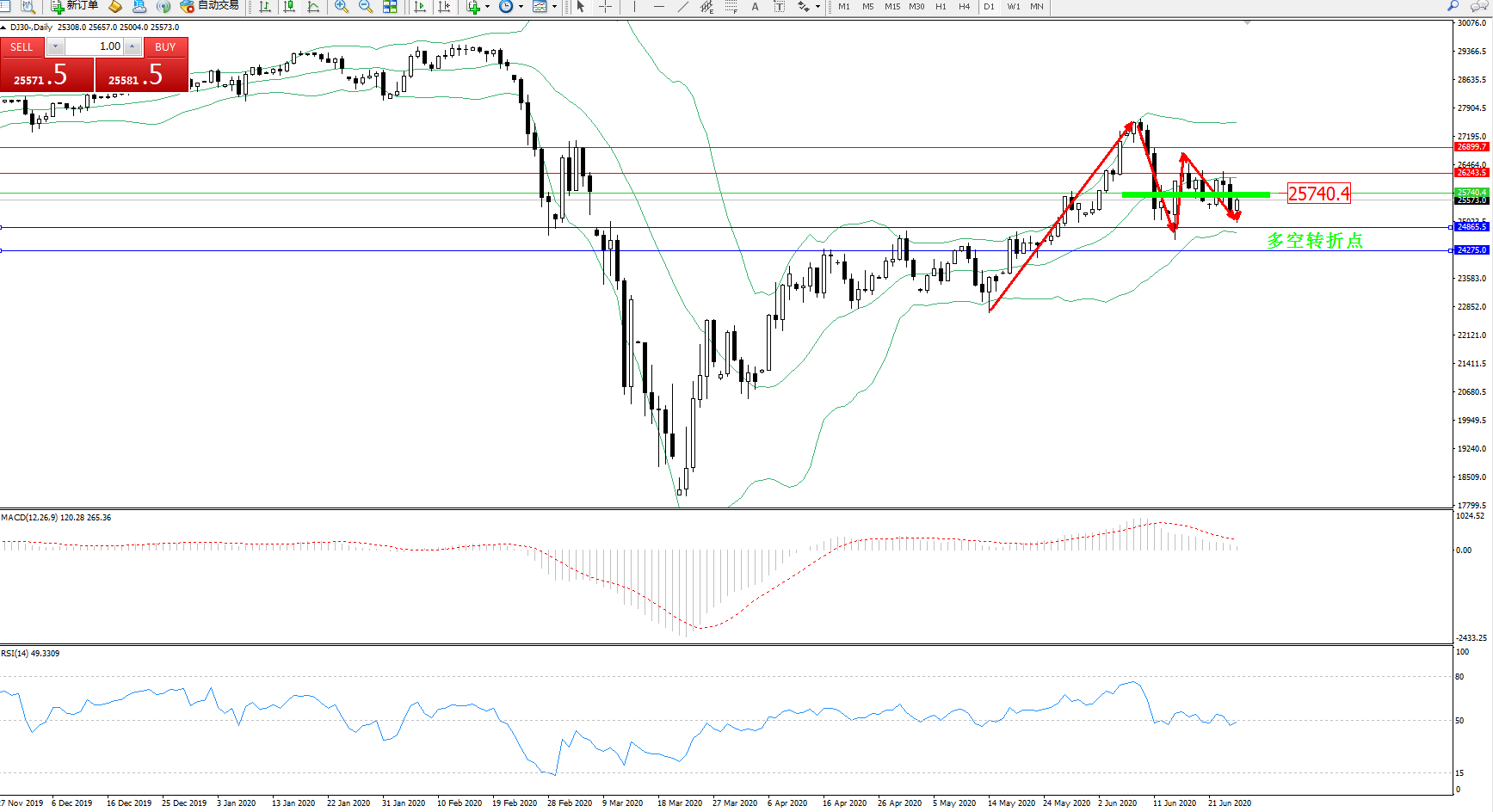 道琼斯指数6月25日(周四)收盘上涨299.70点,涨幅1.18%,报25745.60点.美股低开高收,三大股指均初步收涨超1%,银行板块领涨。银行股飙升2.7%,因监管机构放松沃尔克规则,或为银行业释放大量资金。美国股市创下一周多以来最大涨幅,在新冠病例大幅增长之际,投资者权衡美国推出进一步刺激措施的前景。市场正在试图消化时间表,并衡量货币刺激和未来的财政刺激,有很多未知数,但必须相信货币和财政政策将支持市场,因此对未来18-24个月,市场比较乐观一些。市场正在评估第二波病毒感染可能给经济带来什么样的影响;经济市场似乎受到很好的支撑,因美国和全球出现第二波疫情,以及与此相关的经济担忧正在提升各自需求。