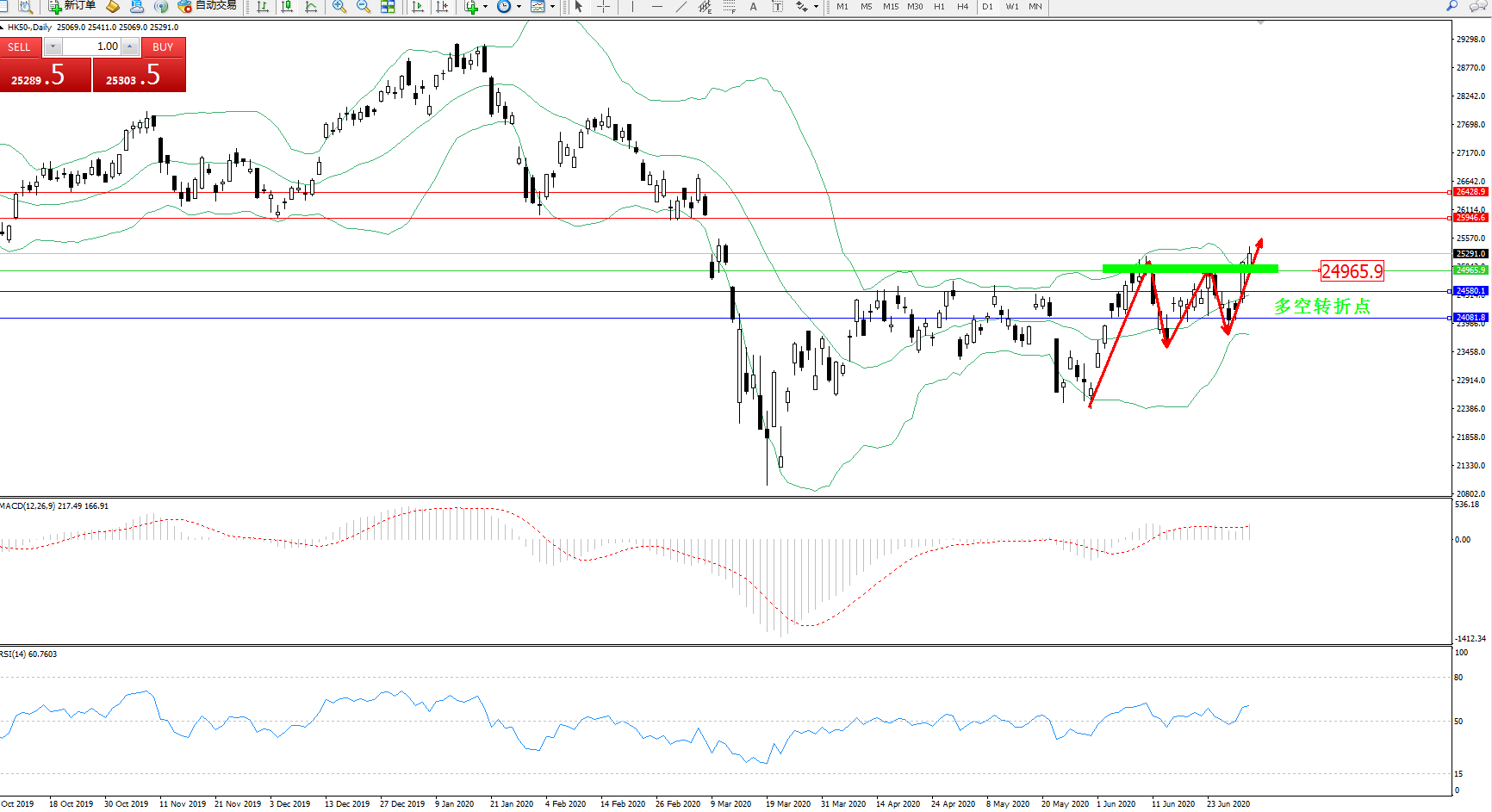 香港恒生指数73日(周五)收盘上涨248.93点,涨幅0.99%,报25373.12点;港股延续昨日强势上涨行情,恒指午后一度升至1.3%创下近4个月新高,国指涨1.85%10243点。南下资金大幅流入50.03亿港元,大市成交额为1639亿港元。港股恒指本周涨3.55%,自3月低点累涨超20%,步入技术性牛市,至此,港股三大股指全部步入技术性牛市。恒指6月的止跌给7月的行情带来了积极信号,对于7月行情可以积极看好,恒指再度冲击年线26140点值得期待。中资券商股继续大涨,光大证券飙涨超26%,两日暴涨超50%,招商证券、中信建投均大涨超14%;手机概念股亦全线走强,瑞声、舜宇均大涨超6%;美团点评涨近7%,市值突破1.1万亿港元;腾讯收涨1.16%,市值站上5万亿港元。
